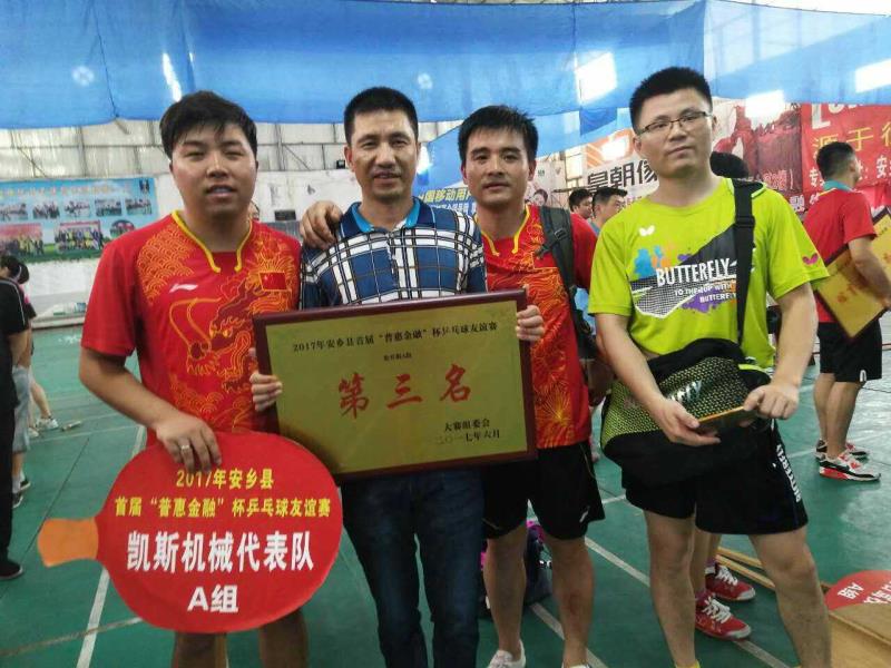 6月10日上午,2017年安鄉縣首屆“普惠金融”杯乒乓球友誼賽在縣體育中心乒羽館勝利閉幕。由二分公司員工彭明、技術中心員工劉歡等人組成的凱斯機械代表隊在本次比賽中取得佳績,獲得公開A組比賽的第三名。